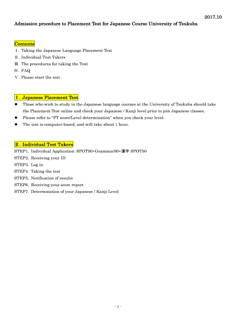 Admission procedure to Placement Test for Japanese Course University of TsukubaContents