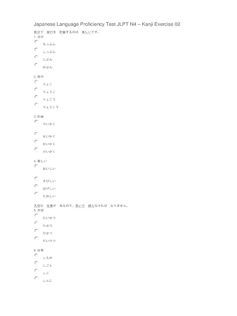 Get the free Japanese Language Proficiency Test JLPT N4 Kanji Exercise 02