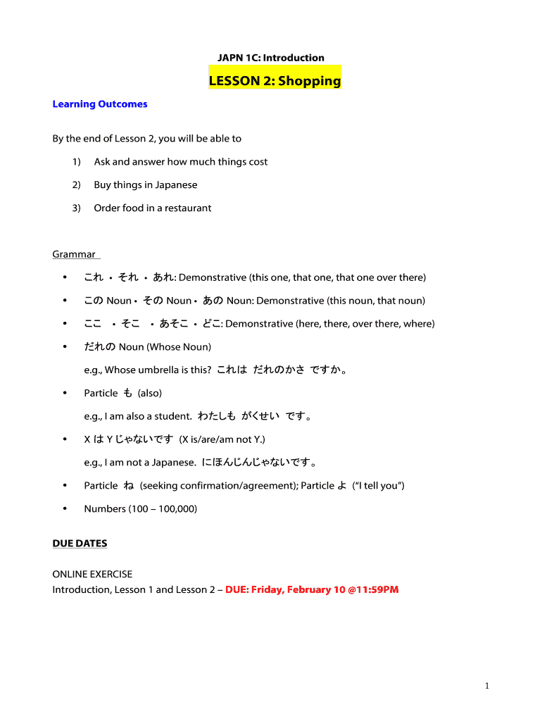 JAPAN 1C: IntroductionLESSON 2: Shopping Learning Outcomes By the end of Lesson 2, you will be able to 1)Ask and answer how many things cost2)Buy things in Japanese3)Order food in a restaurantGrammar