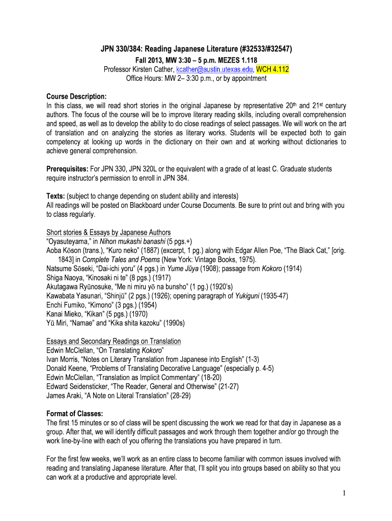 JPN 330/384: Reading Japanese Literature (#32533/#32547) Fall 2013, MW 3:30 5 p.m. MEZES 1.118 Professor Kirsten Cather, Cather Austin.Texas.edu, WC 4.112 Office Hours: MW 2 3:30 p.m., or by appointment