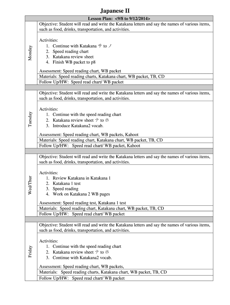 Japanese IIMondayLesson Plan: 9/8 to 9/12/2014 Objective: Student will read and write the Katakana letters and say the names of various items, such as food, drinks, transportation, and activities.