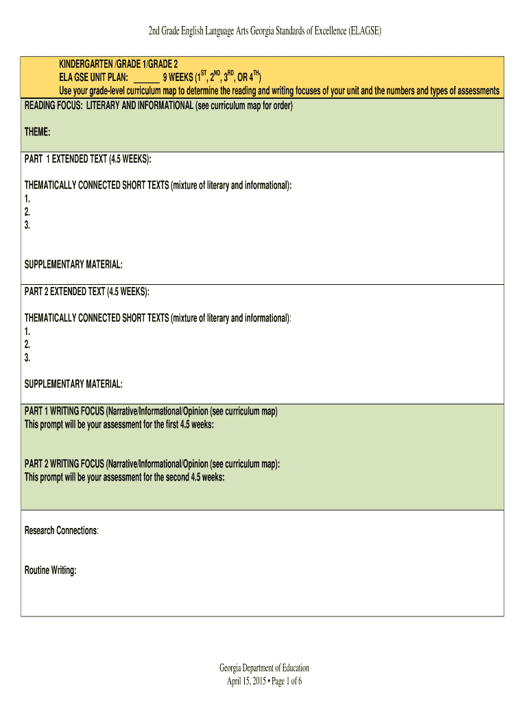 2nd Grade English Language Arts Georgia Standards of Excellence (ELAPSE) KINDERGARTEN /GRADE 1/GRADE 2 ST ND RD TH ELA GSE UNIT PLAN: 9 WEEKS (1, 2, 3, OR 4) Use your grade level curriculum map to