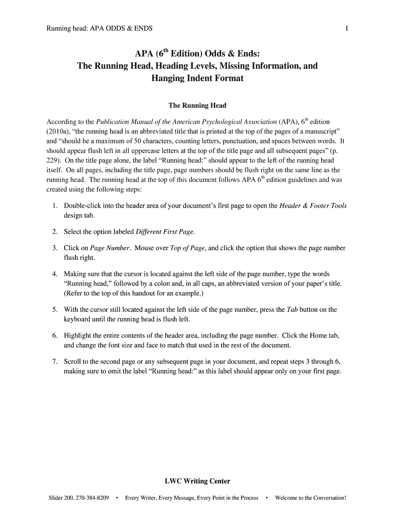 Running head: APA ODDS & ENDS1APA (6th Edition) Odds & Ends: The Running Head, Heading Levels, Missing Information, and Hanging Indent Format The Running Head According to the Publication Manual of