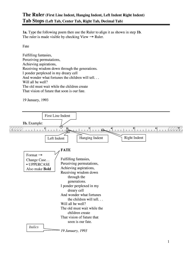 The Ruler (First Line Indent, Hanging Indent, Left Indent Right Indent) Tab Stops (Left Tab, Center Tab, Right Tab, Decimal Tab) 1a. Type the following poem then use the Ruler to align it as shown