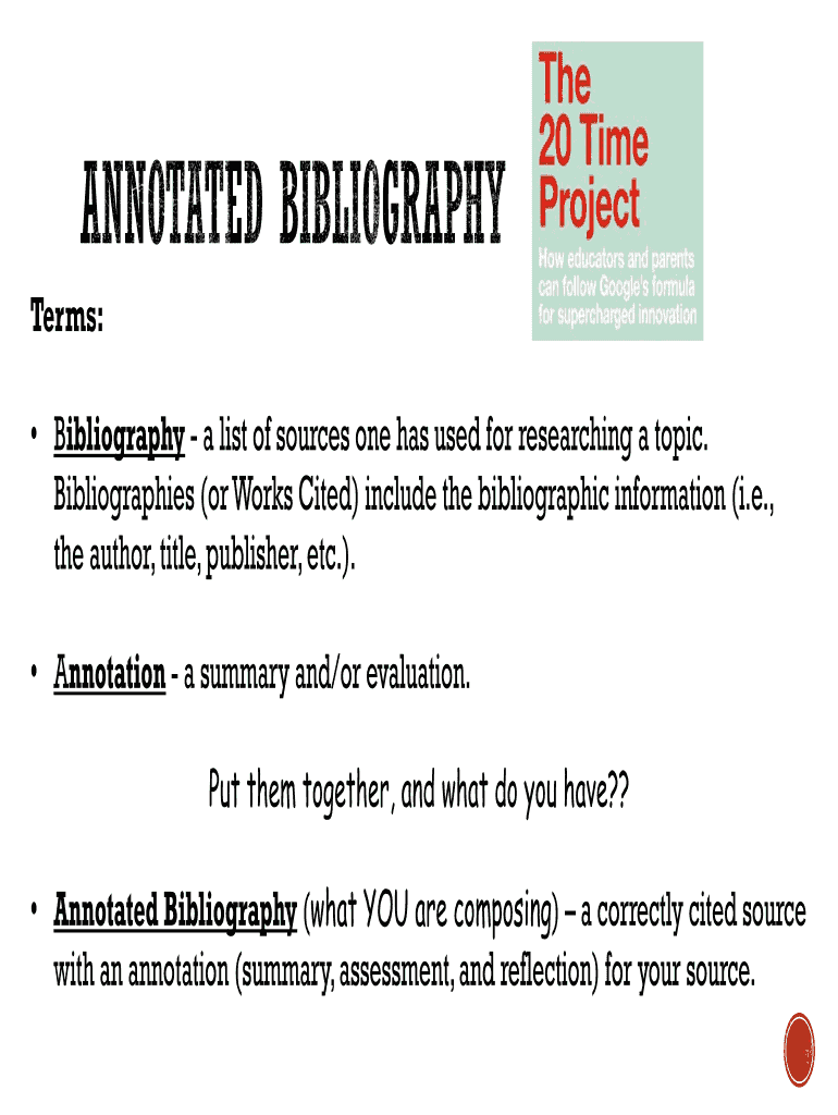 Terms: Bibliography a list of sources one has used for researching a topic. Bibliographies (or Works Cited) include the bibliographic information (i.e., the author, title, publisher, etc.). Annotation