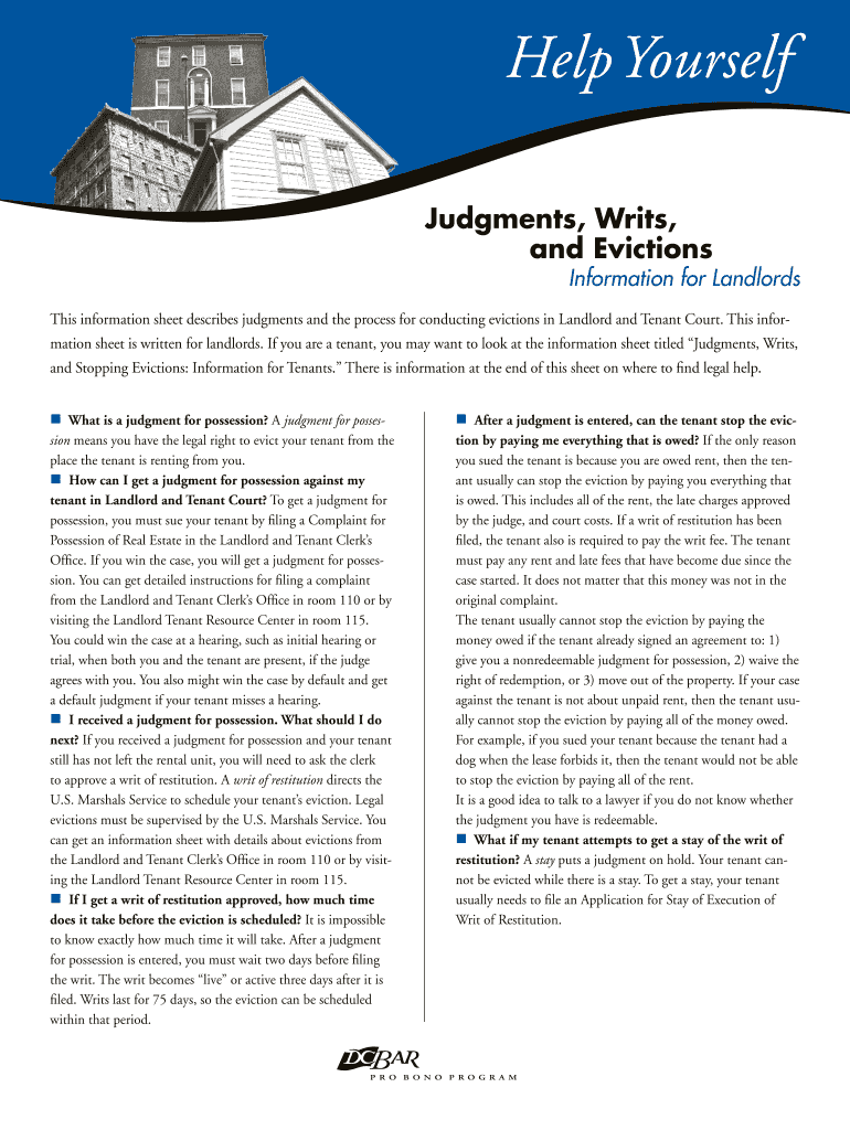 Judgments, Writs, and EvictionsInformation for LandlordsThis information sheet describes judgments and the process for conducting evictions in Landlord and Tenant Court. This information