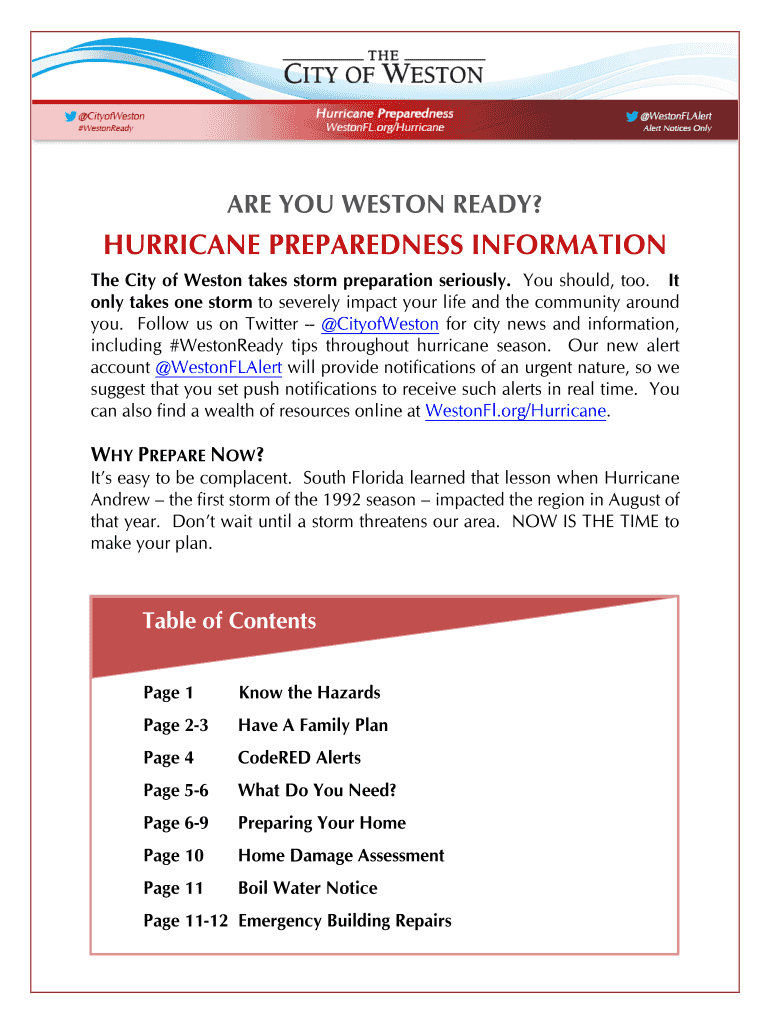 ARE YOU WESTON READY?HURRICANE PREPAREDNESS INFORMATION The City of Weston takes storm preparation seriously. You should, too. It only takes one storm to severely impact your life and the surrounding