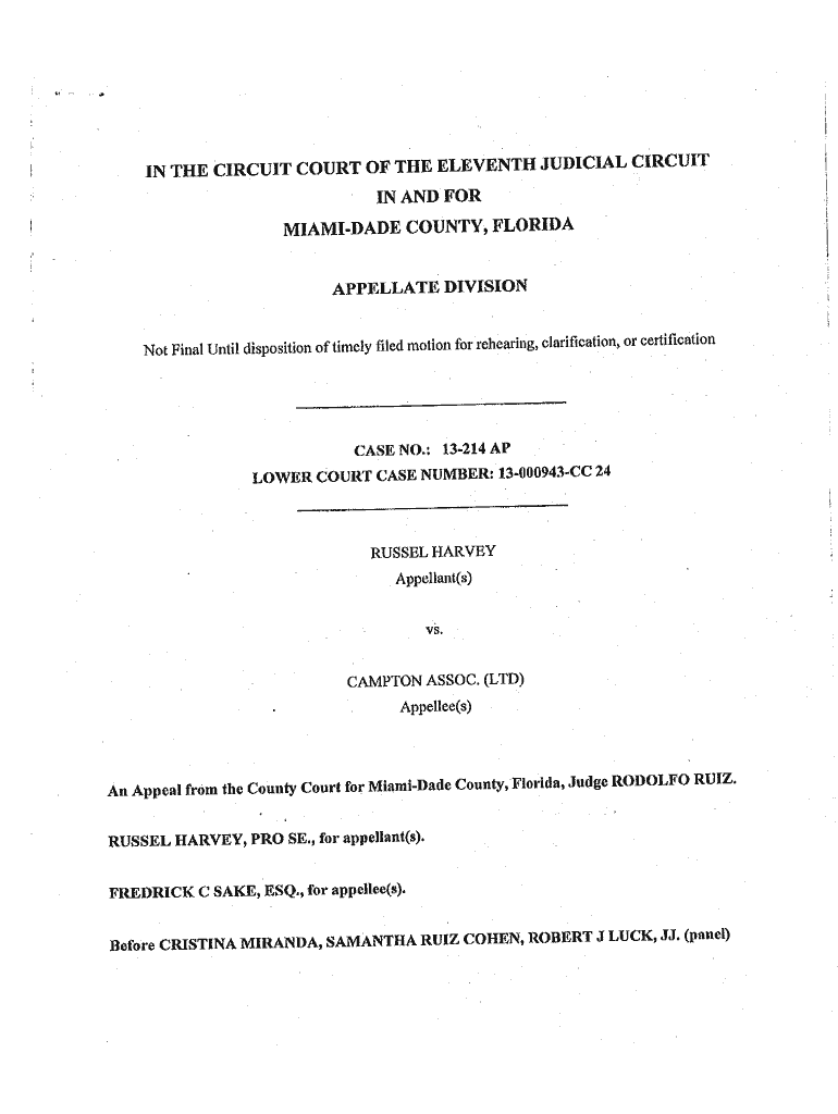Main THE CIRCUIT COURT OF THE ELEVENTH JUDICIAL CIRCUIT 'IN AND FORMIAMIDADE COUNTY, FLORIDA 'APPELLATE DIVISION Not Final Until disposition of timely led motion for 'red 'cabin 'g, clarification,