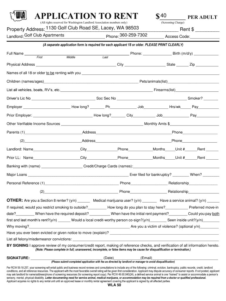 APPLICATION TO RENT (All rights reserved for Washington Landlord Association members only)$40 PER ADULT (Screening Charge)1130 Golf Club Road SE, Lacey, WA 98503 Property Address: Rent $3602597302
