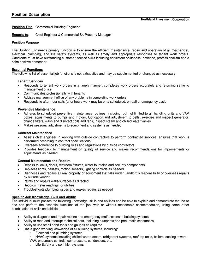 Position Description Northland Investment CorporationPosition Title: Commercial Building Engineer Reports to:Chief Engineer & Commercial Sr. Property ManagerPosition Purpose The Building Engineers