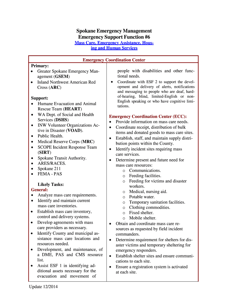 Spokane Emergency Management Emergency Support Function #6 Mass Care, Emergency Assistance, Housing and Human Services Emergency Coordination Center Primary: people with disabilities and other fun