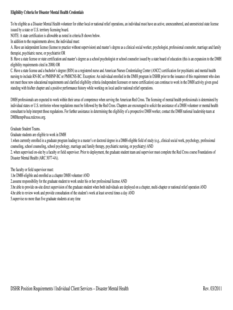 To be eligible as a Disaster Mental Health volunteer for either local or national relief operations, an individual must have an active,