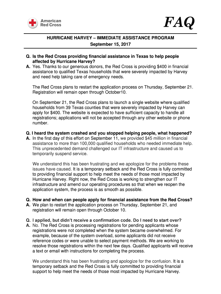 HURRICANE HARVEY IMMEDIATE ASSISTANCE PROGRAM September 15, 2017, Q. Is the Red Cross providing financial assistance in Texas to help people affected by Hurricane Harvey? A. Yes. Thanks to our generous