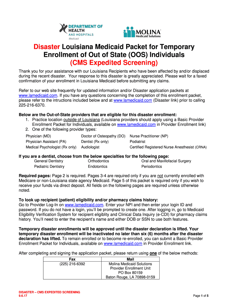 Get the free Disaster Louisiana Medicaid Packet for Temporary