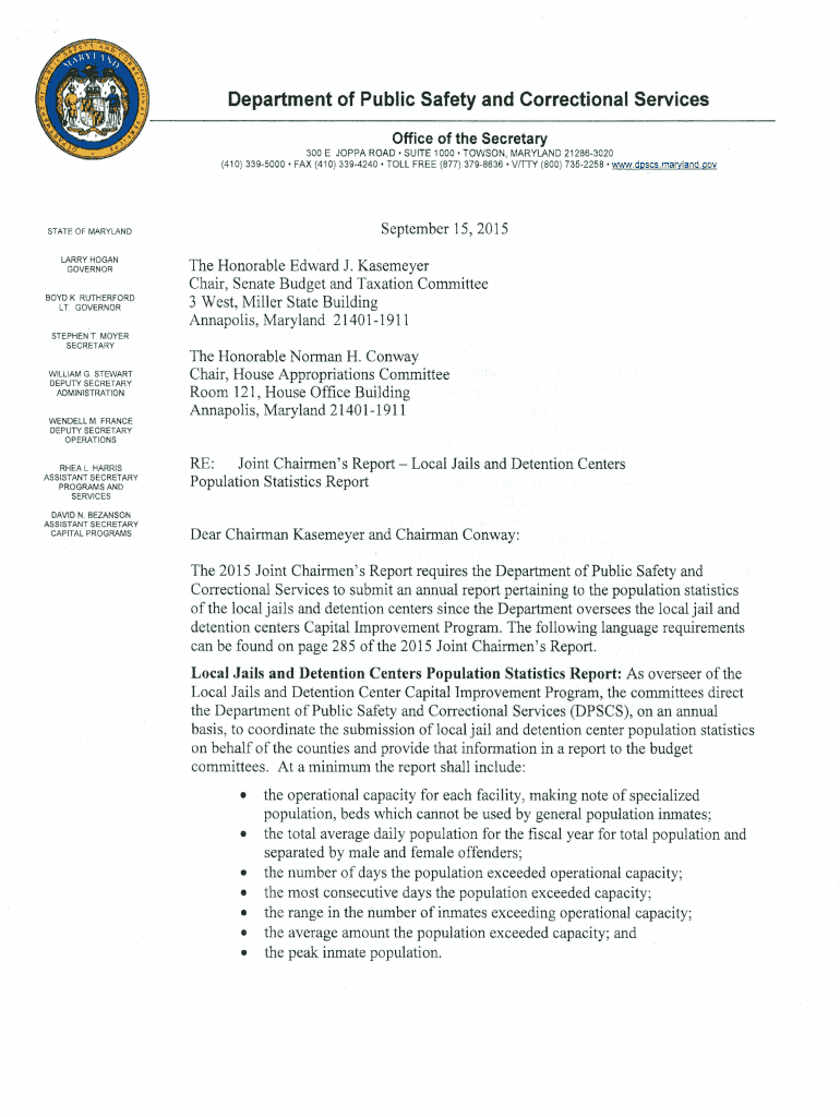 Department of Public Safety and Correctional Services Office of the Secretary (410) 3395000 'BOYD K RUTHERFORD LT GOVERNORMARYLAND 212863020 KITTY (800) 7352258 WWW.discs.Maryland.gov September 15,2015STATE