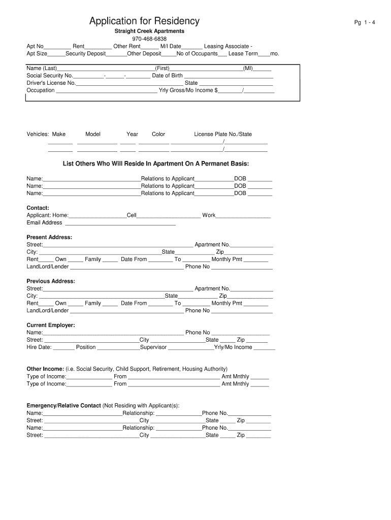 Application for Residency Straight Creek Apartments 970-468-6838 Apt No Rent Other Rent M/I Date Leasing Associate Apt Size Security Deposit Other Deposit No of Occupants Lease Term mo. Name (Last)