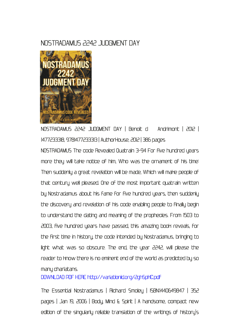 NOSTRADAMUS 2242 JUDGMENT NOSTRADAMUS 2242 JUDGMENT DAY Benoit dAndrimont 2012 1477233318, 9781477233313 Author House, 2012 386 pages NOSTRADAMUS The code Revealed Quatrain 394 For five hundred years