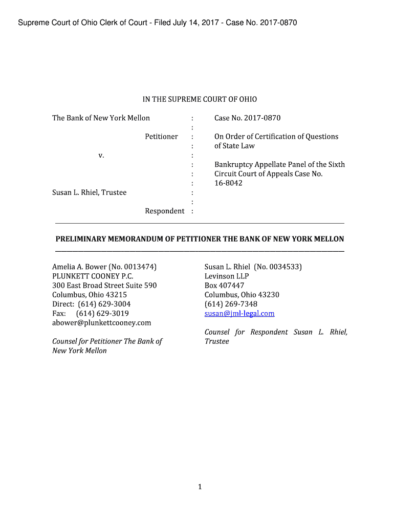 Supreme Court of Ohio Clerk of Court Filed July 14, 2017, Case No. 20170870IN THE SUPREME COURT OF OHIO The Bank of New York Mellon: Case No. 20170870 : Petitioner : On Order of Certification of Questions