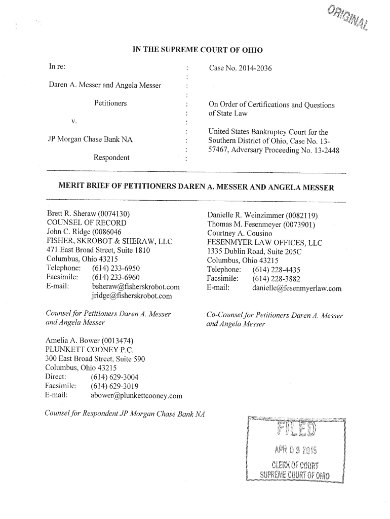 IN THE SUPREME COURT OF OHIO In re:Case No. 20142036Daren A. Lesser and Angela Lesser Petitioners Order of Certifications and Questions of State Law. United States Bankruptcy Court for the JP Morgan
