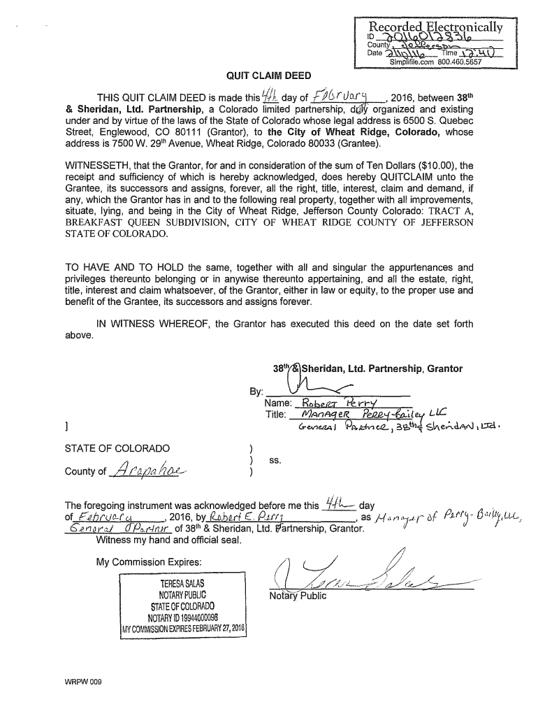 Recorded Electronically :; 2 siffiimre.com Daytime,.!, ) 800.460.5657QUIT CLAIM DEED THIS QUIT CLAIM DEED is made this 1 day of FJ;, r UO. 2016, between 381h & Sheridan, Ltd. Partnership, a Colorado