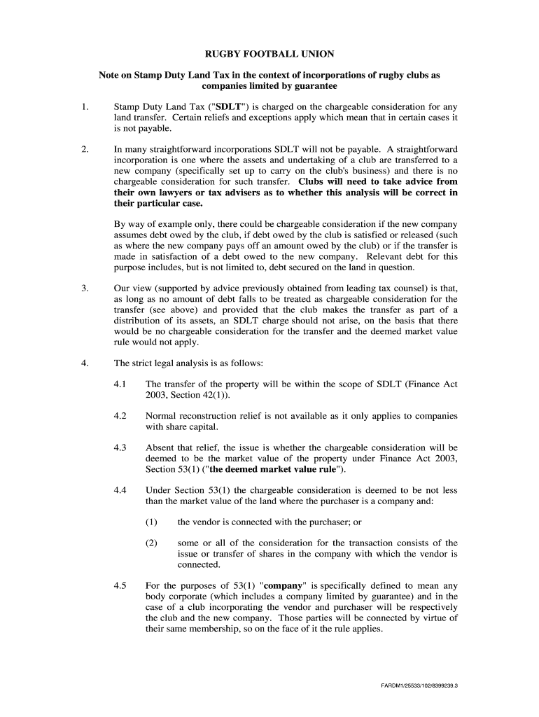 RUGBY FOOTBALL UNION Note on Stamp Duty Land Tax in the context of incorporation of rugby clubs as companies limited by guarantee 1. Stamp Duty Land Tax (“SALT “) is charged on the chargeable