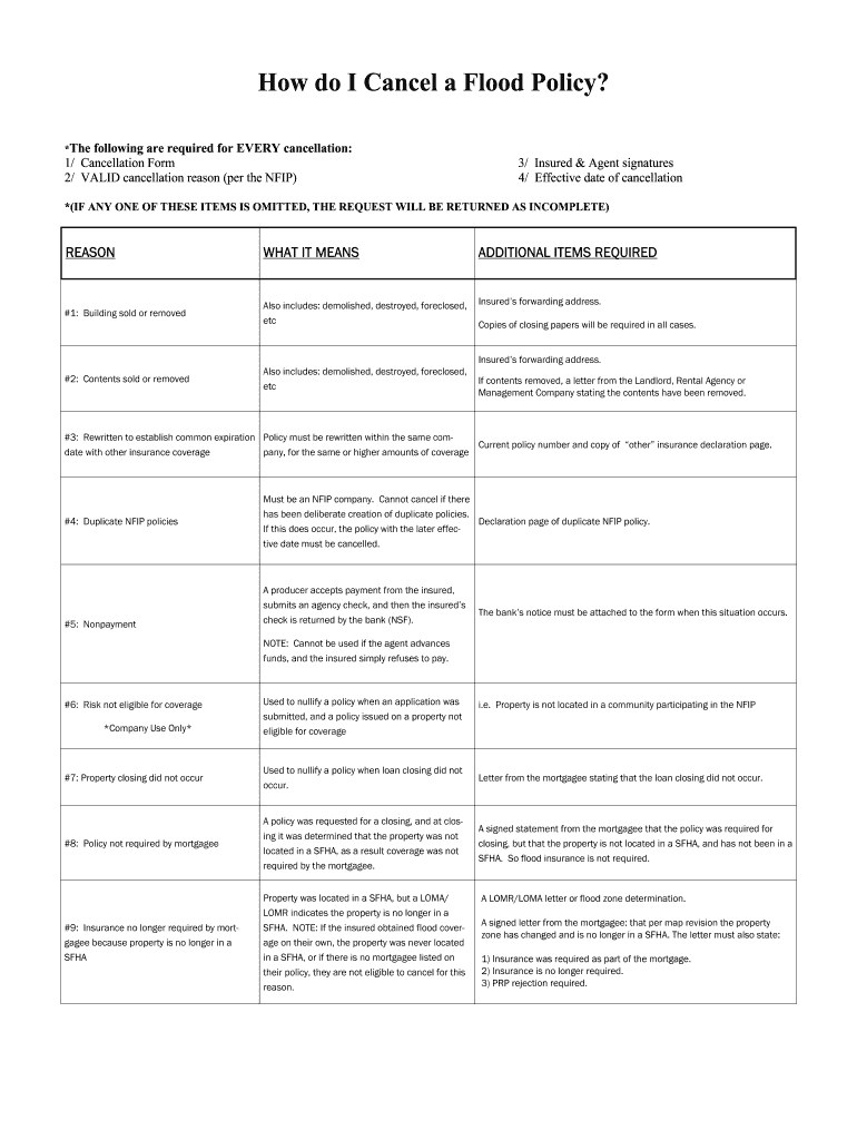 How do I Cancel a Flood Policy? *The following are required for EVERY cancellation: 1/ Cancellation Form 2/ VALID cancellation reason (per the FIP)3/ Insured & Agent signatures 4/ Effective date of