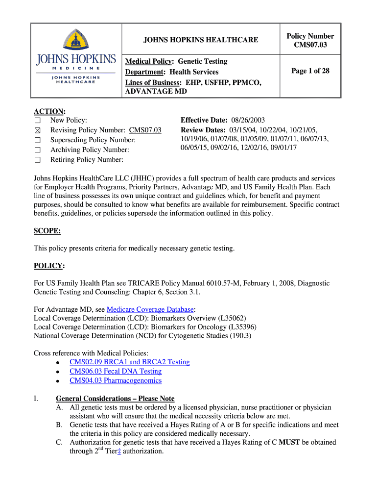 JOHNS HOPKINS HEALTHCARE Medical Policy: Genetic Testing Department: Health Services Lines of Business: HP, USF HP, PP MCO, ADVANTAGE MD ACTION: New Policy: Revising Policy Number: CMS07.03 Superseding