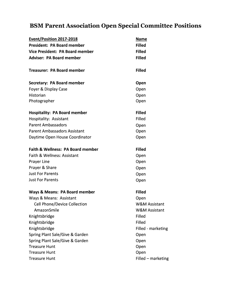 Get the free BSM Parent Association Open Special Committee Positions