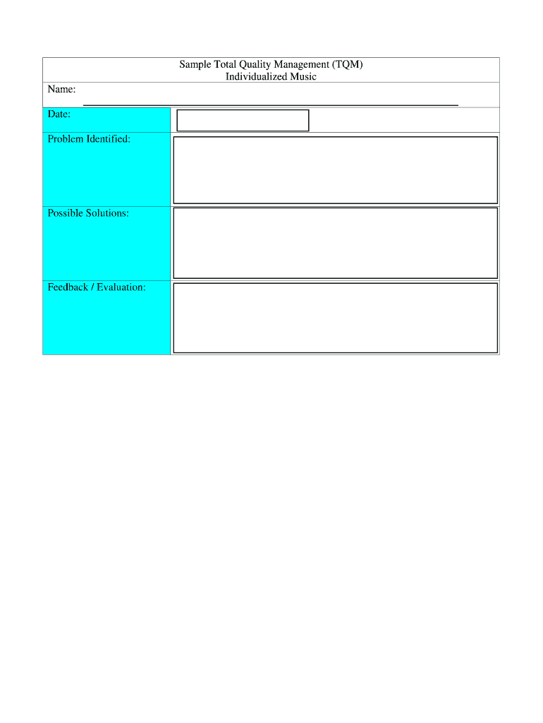 The TQM Form comprises several clearly defined fields that guide users in documenting essential information related to quality management. Users will encounter fields such as Name, Date, Problem Identified, Possible Solutions, and Feedback/Evaluation.