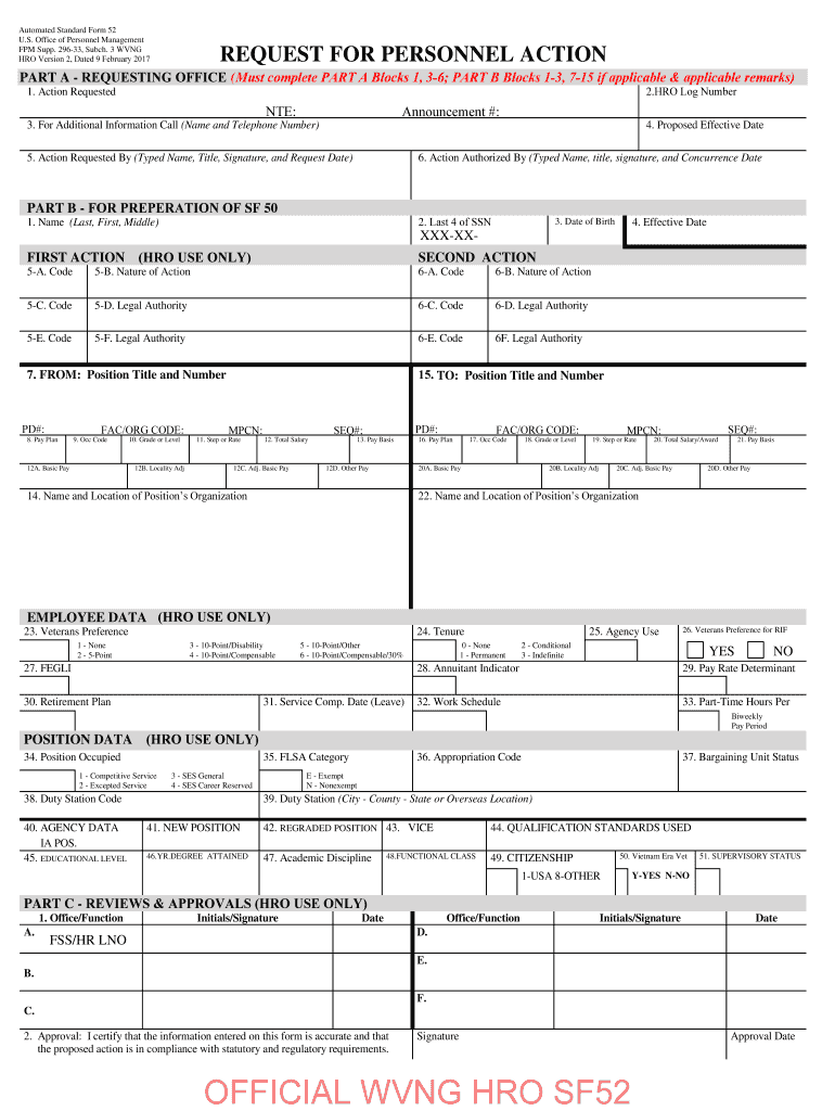 PRO PASSWORD: Automated Standard Form 52 U.S. Office of Personnel Management FPM Supp. 29633, Such. 3 WING PRO Version 2, Dated 9 February 2017REQUEST FOR PERSONNEL ACTIONPART A REQUESTING OFFICE