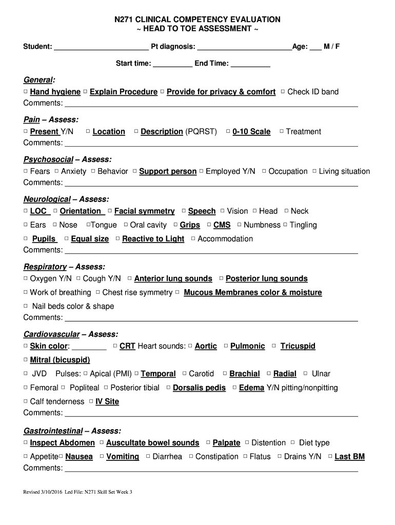 N271 CLINICAL COMPETENCY EVALUATION HEAD TO TOE ASSESSMENT Student: Pt diagnosis: Age: M / F Start time: End Time: General: Hand hygiene Explain Procedure Provide for privacy & comfort Check ID band