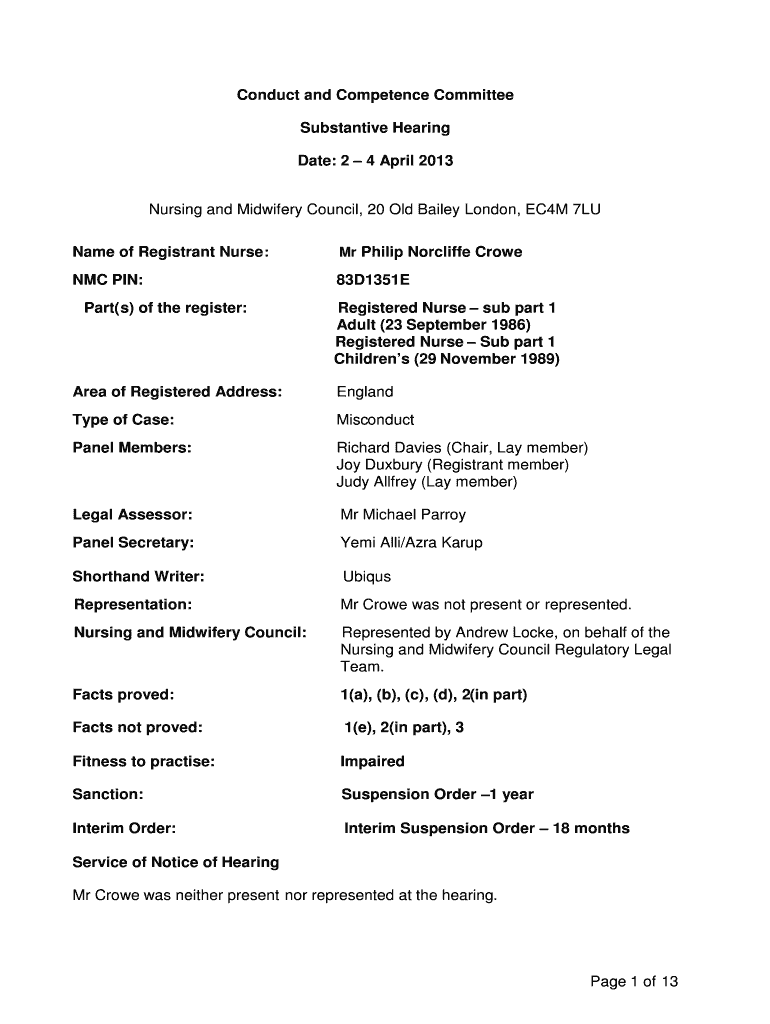 Conduct and Competence Committee Substantive Hearing Date: 2 4 April 2013 Nursing and Midwifery Council, 20 Old Bailey London, EC4M 7LU Name of Registrant Nurse :Mr Philip Radcliffe Crowe NMC PIN:83D1351EPart(s)