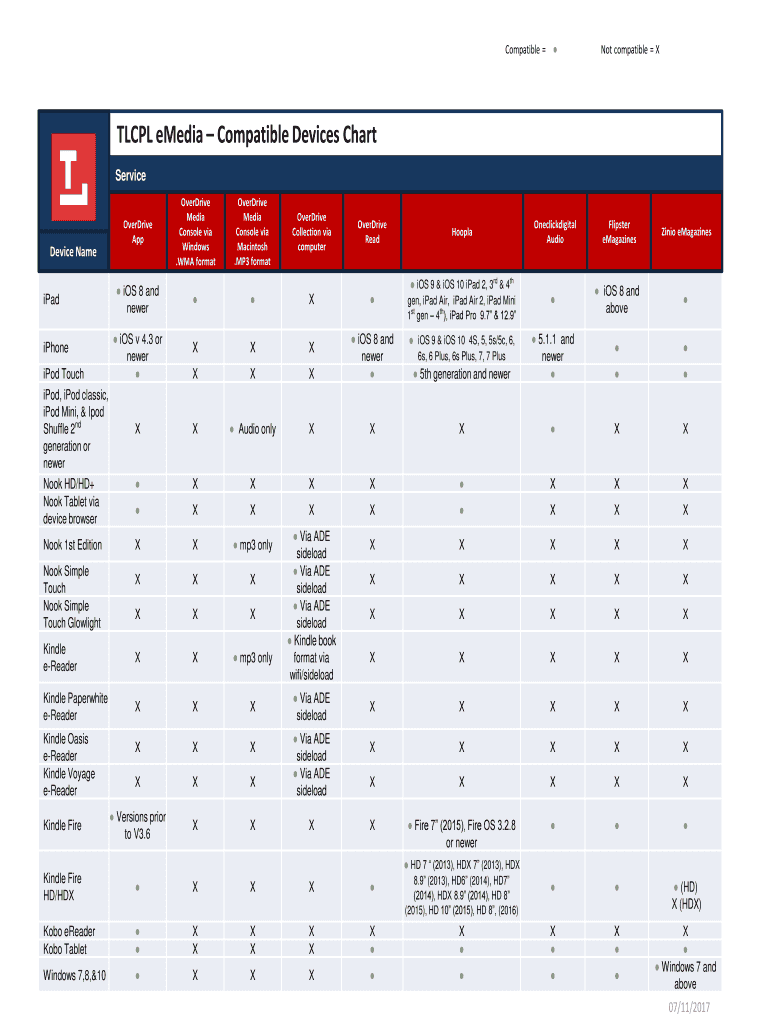 Compatible Not compatible TLC media Compatible Devices Chart ServiceDevice Name iPadOverDrive Overdrive Media Console via Windows .WMA formatOverDrive Media Console via Macintosh.MP3 formatOverDrive