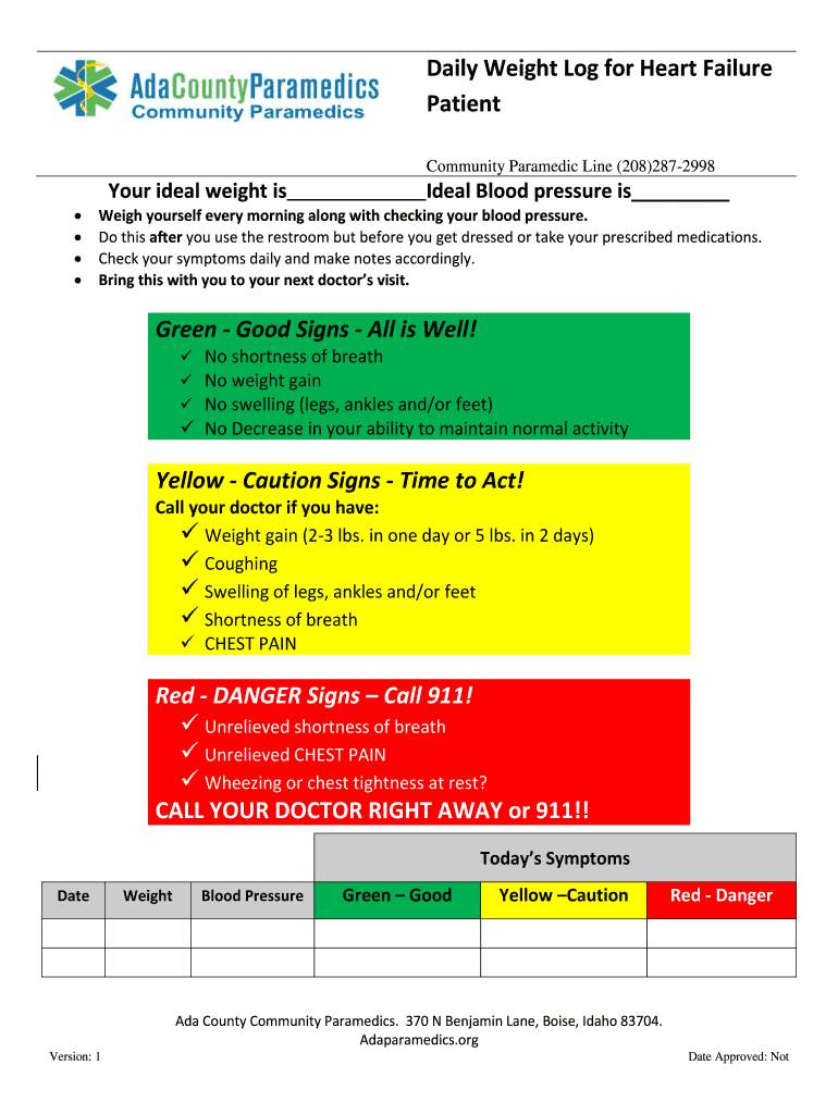 Daily Weight Log for Heart Failure Patient Community Paramedic Line (208)2872998Your ideal weight is Ideal Blood pressure is Weigh yourself every morning along with checking your blood pressure. Do
