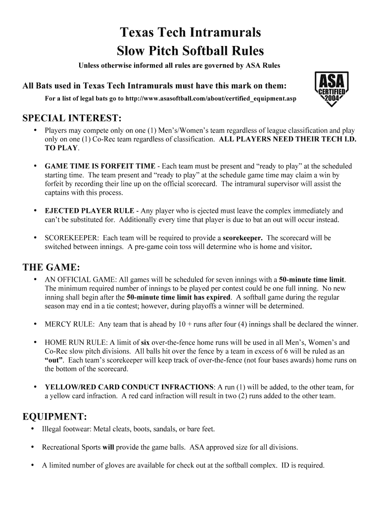 Unless otherwise informed all rules are governed by ASA Rules Bats used in Texas Tech Intramural must have this mark on them: