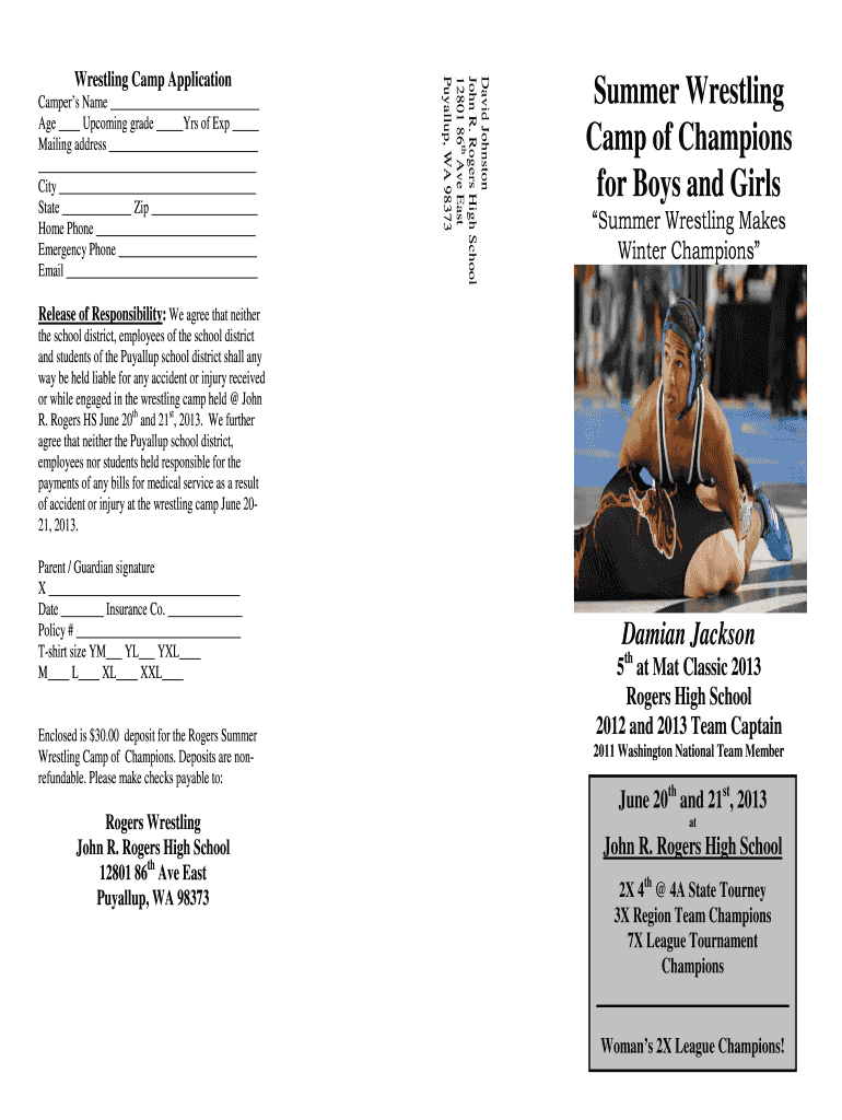 David Johnston John R. Rogers High School 12801 86th Ave East Puyallup, WA 98373Wrestling Camp Application Campers Name Age Upcoming grade Yrs of Exp Mailing address City State Zip Home Phone Emergency