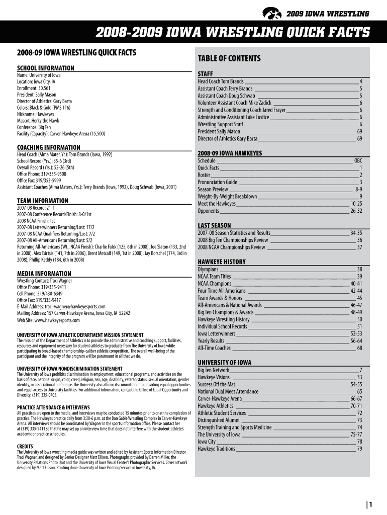 2009 Iowa wrestling20082009 Iowa wrestling quick facts 200809 IOWA WRESTLING QUICK FACTS School Informational: University of Iowa Location: Iowa City, IA Enrollment: 30,561 President: Sally Mason