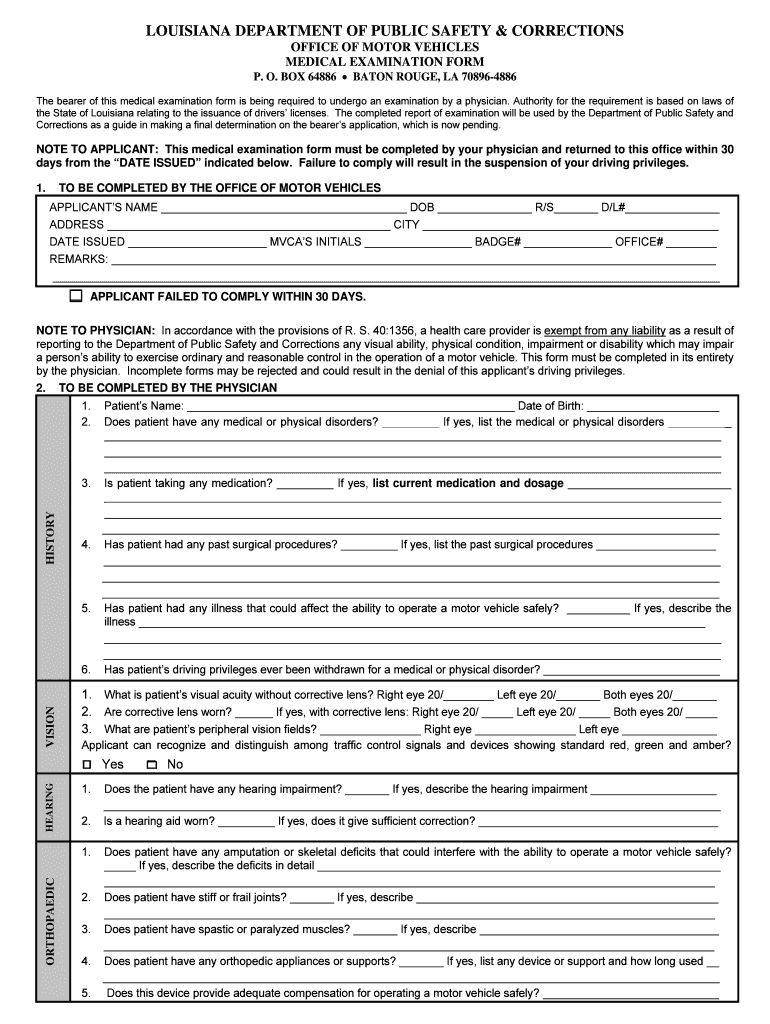 Anyone applying for a driver’s license in Louisiana must complete this medical form, which requires a physician's evaluation to determine medical fitness.