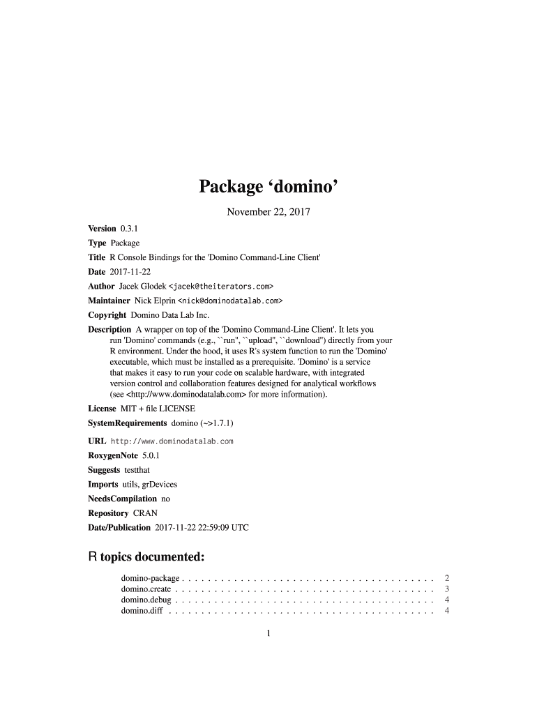 Package domino November 22, 2017, Version 0.3.1 Type Package Title R Console Bindings for the 'Domino Commanding Client Date 20171122 Author Jacek Golden Jacek theiterators.com Maintainer Nick Erin