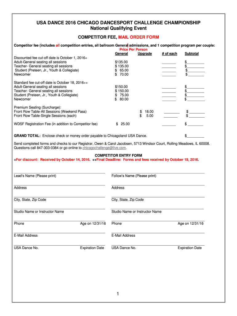 USA DANCE 2016 CHICAGO ANCESTOR CHALLENGE CHAMPIONSHIP National Qualifying Event COMPETITOR FEE, MAIL ORDER FORM Competitor fee (includes all competition entries, all ballroom General admissions,