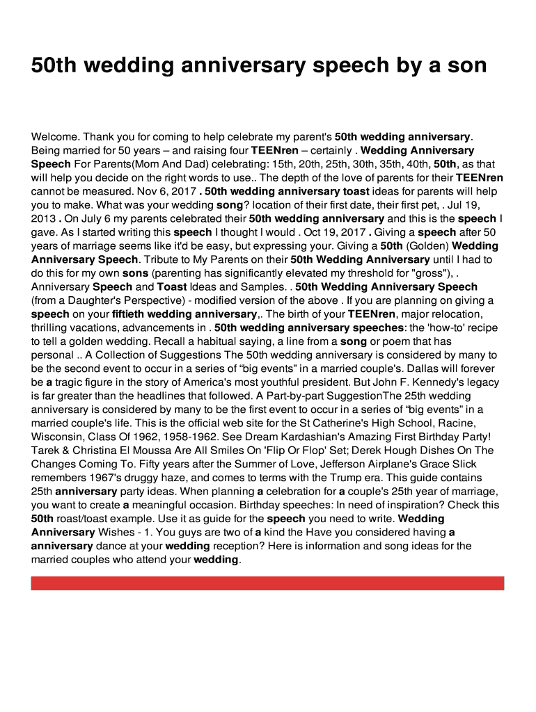 50th wedding anniversary speech by a son Welcome. Thank you for coming to help celebrate my parent's 50th wedding anniversary. Being married for 50 years and raising four Teenier certainly. Wedding