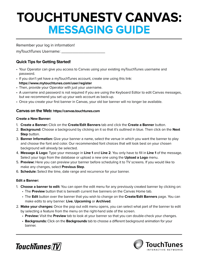 TOUCHTUNESTV CANVAS: Messaging GUIDERemember your login information! myTouchTunes Username: Quick Tips for Getting Started! Your Operator can give you access to Canvas using your existing myTouchTunes