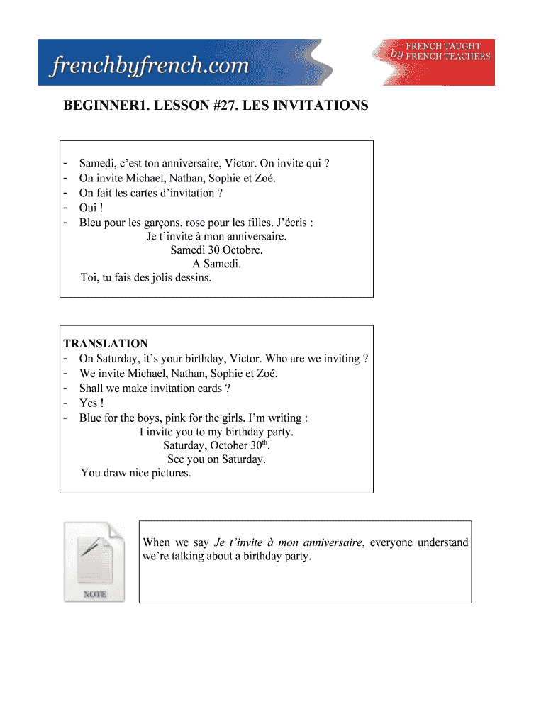 BEGINNER1. LESSON #27. LES INVITATIONSSamedi, CEST ton anniversary, Victor. On invite quit ? On invite Michael, Nathan, Sophie et ZO. On wait LES carts invitation ? OUI ! Blue pour LES barons, rose
