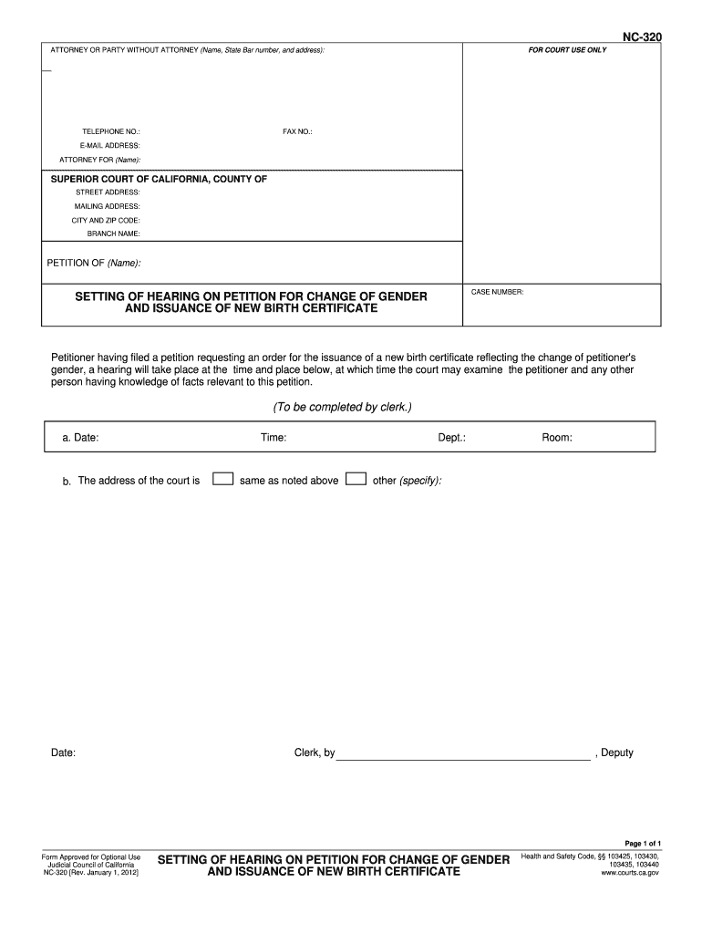 Get the free NC-320 SETTING OF HEARING ON PETITION FOR CHANGE OF GENDER ... - courtinfo ca