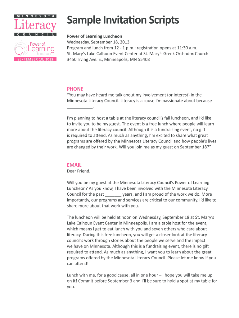Sample Invitation Scripts Power learning Luncheon S E P T E M B E R 18, 2013Power of Learning Luncheon Wednesday, September 18, 2013, Program and lunch from 12 1 p.m.; registration opens at 11:30