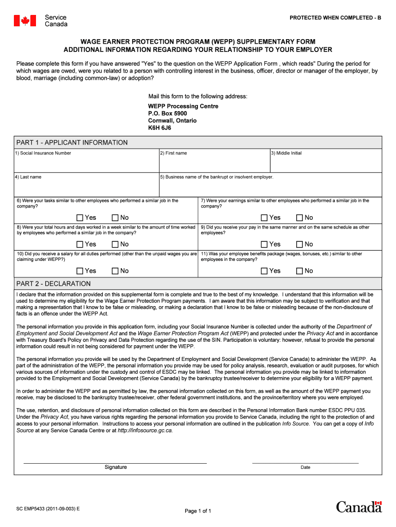 The Wage Earner Protection Program Supplementary Form is essential for applicants seeking wage protection benefits in Canada. This form is specifically required when an applicant indicates 'Yes' to a particular question on the WEPP Application Form. The supplementary form collects critical information regarding the employment relationship between the applicant and their employer, which is vital for determining eligibility.