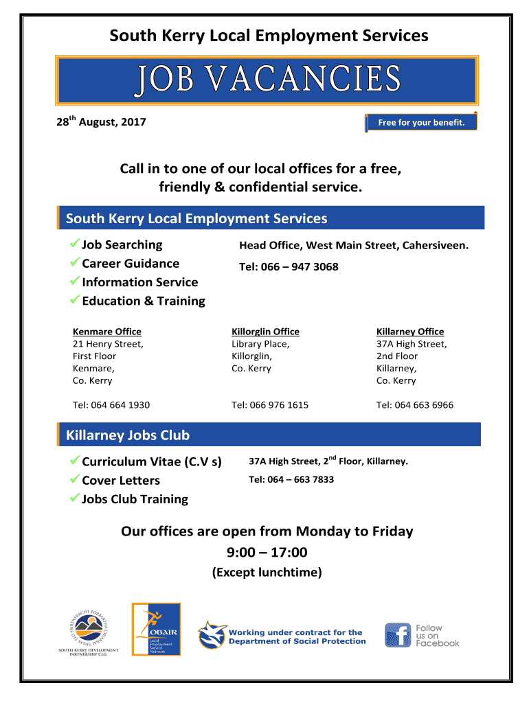 South Kerry Local Employment Services28th August, 2017Free for your benefit. Call in to one of our local offices for a free, friendly & confidential service. South Kerry Local Employment Services