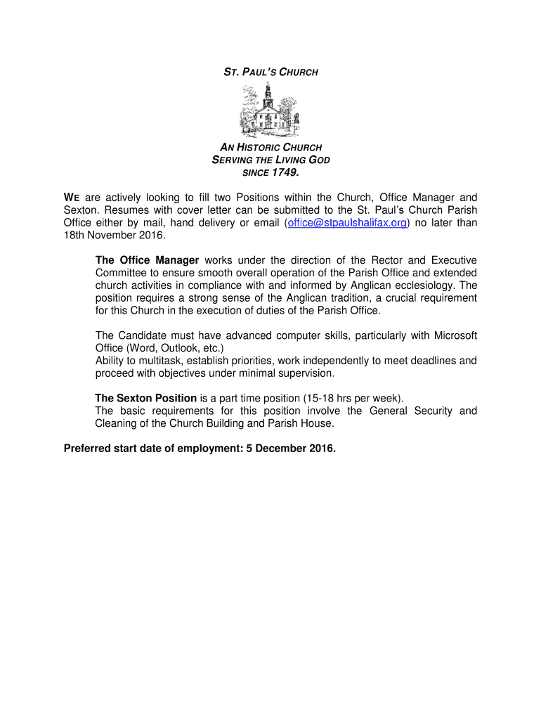 WE are actively looking to fill two Positions within the Church, Office Manager and