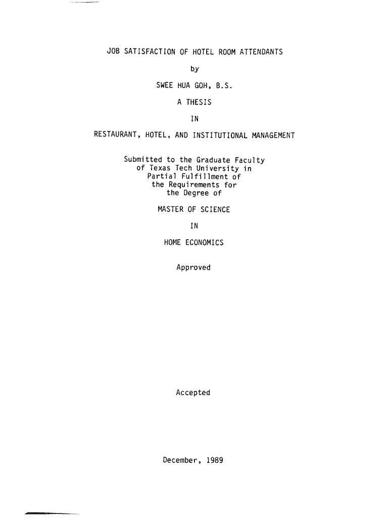 JOB SATISFACTION OF HOTEL ROOM ATTENDANTS by SEE HUB GO, B.S. A THESIS IN RESTAURANT, HOTEL, AND INSTITUTIONAL MANAGEMENT Submitted to the Graduate Faculty of Texas Tech University in Partial Fulfillment
