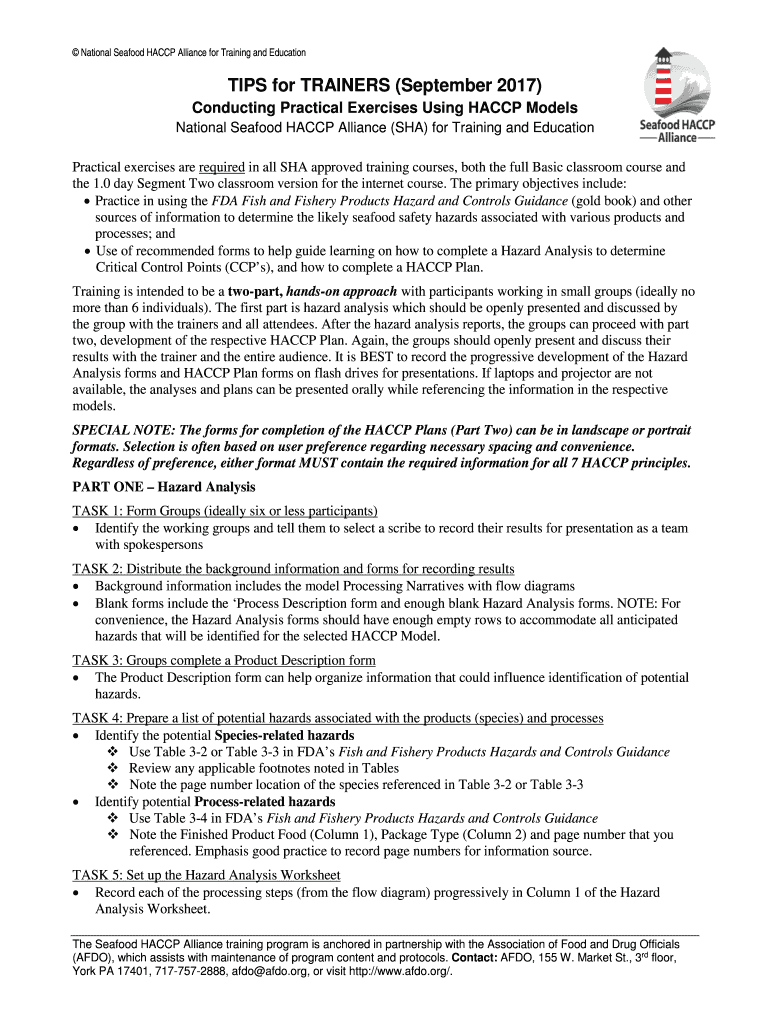 National Seafood HACCP Alliance for Training and Educations for TRAINERS (September 2017) Conducting Practical Exercises Using HACCP Models National Seafood HACCP Alliance (SHA) for Training and Education